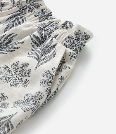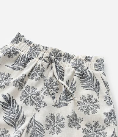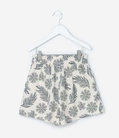 Ref: Shortinho infantil de modelo clochard, confeccionado em viscose e linho. Possui amarração no cós, bolsos e estampa de folhagens pontilhadas.