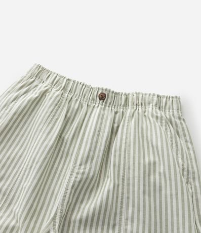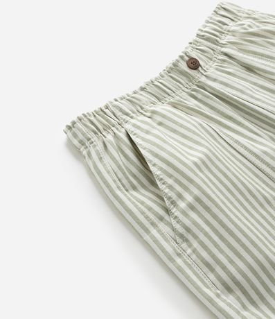 Short comfy confeccionado em sarja composta por algodão BCI. A peça tem cós elástico, botão tartaruga, bolso faca e estampa listrada.