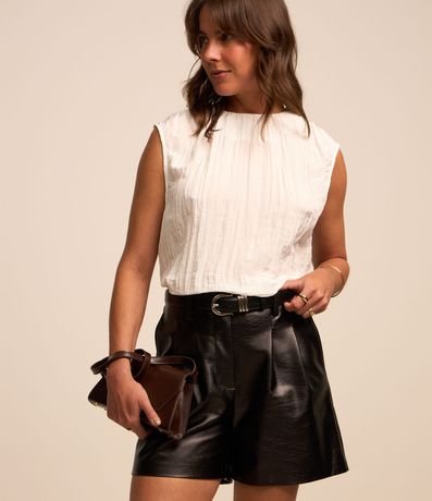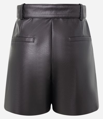 Short Curto em PU com Prega Frontal e Cinto com Fivela Forrada