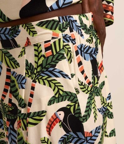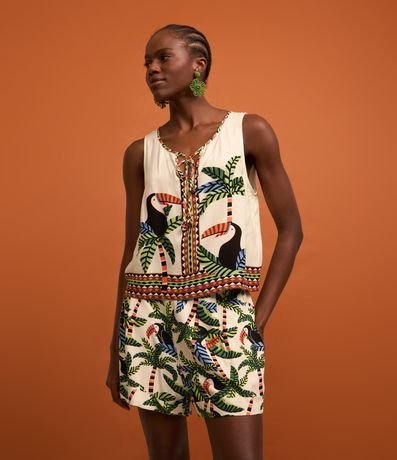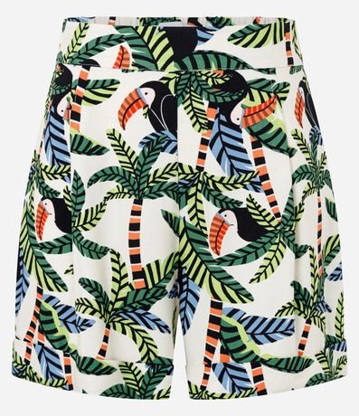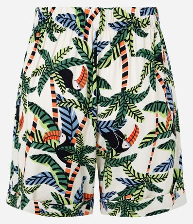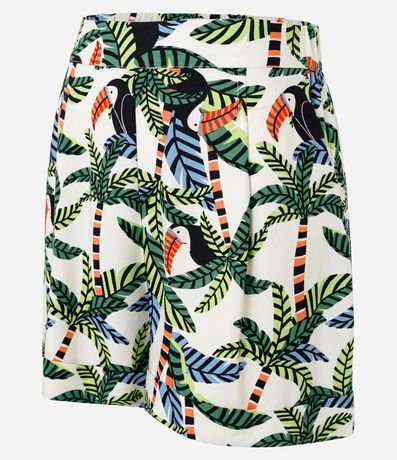 Ref: Short regular confeccionado em viscose mais sustentável, barra dobrada e estampa de folhagens com tucanos.