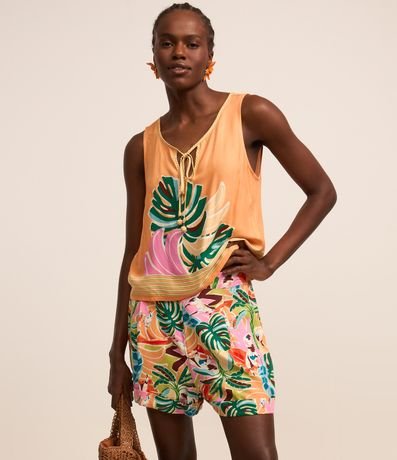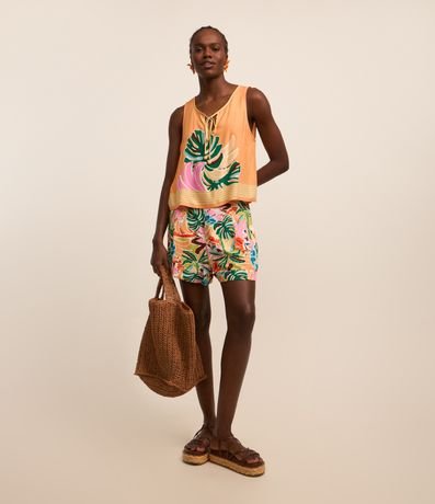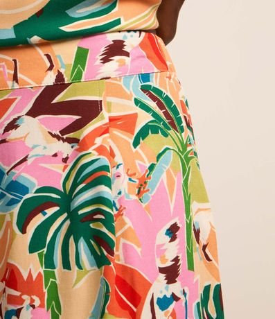 Short regular confeccionado em viscose mais sustentável, barra dobrada e estampa de folhagens com tucanos.