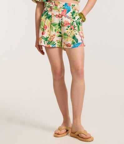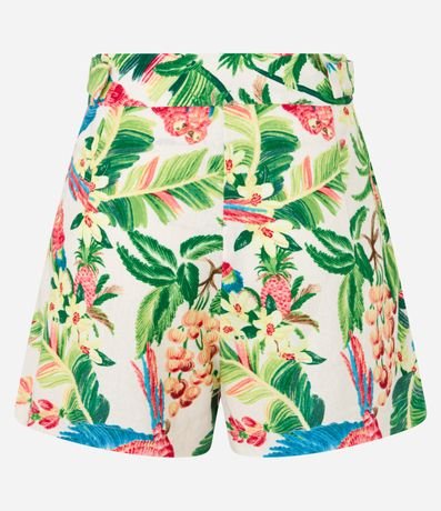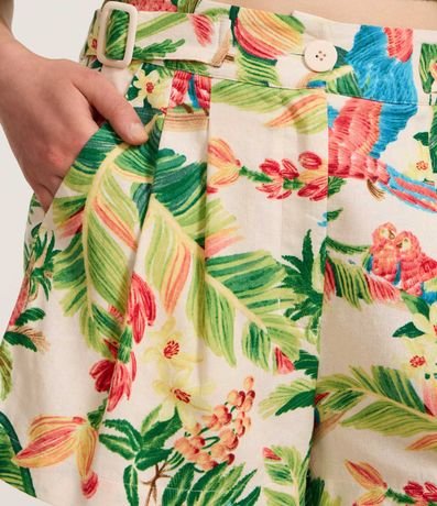Short Curto em Viscolinho com Fivelas e Estampa Tropical