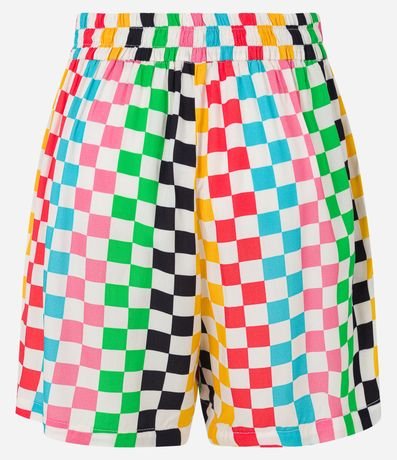 Ref: Shortinho curto, em viscose, bolsos laterais e estampa quadriculada e colorida.