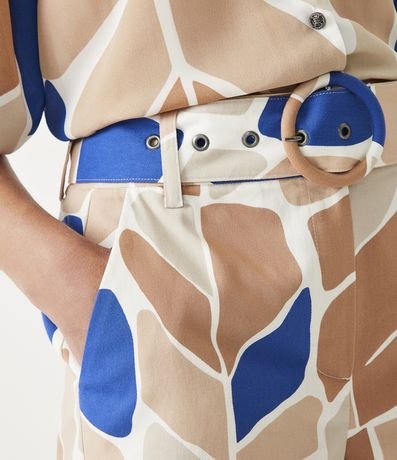 Short em algodão, com passantes no cós, cinto e fivela forrados e estampa folhagens.
