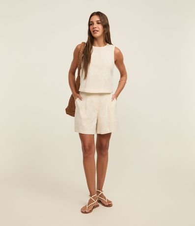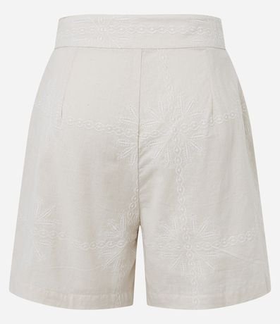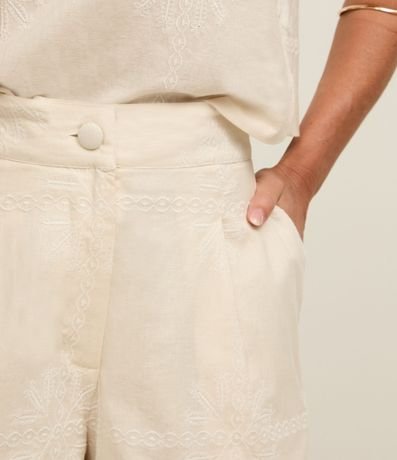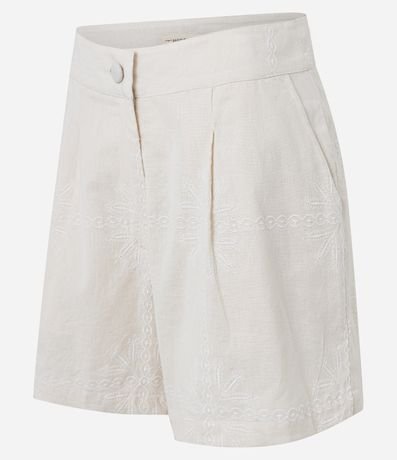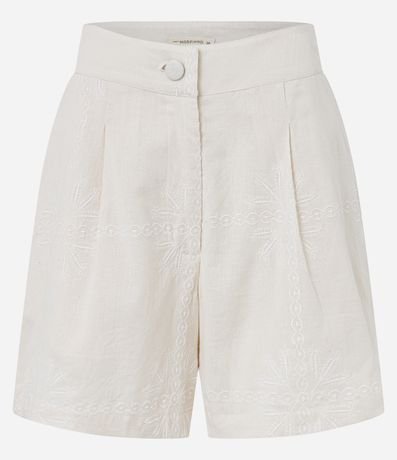 Ref: Short de cintura alta confeccionado em tecido cambraia, composto por algodão e linho, com cós liso e pregas frontais. Possui bordados arabescos.