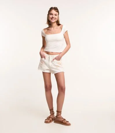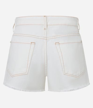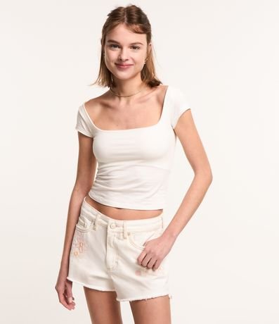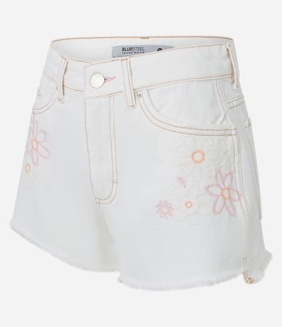 Ref: Short regular confeccionado em sarja com passantes na cintura, fechamento tradicional por botão e zíper, bolsos frontais, bolsos traseiros, barras desfeitas com franjinhas e flores bordadas.