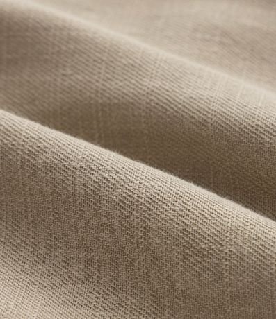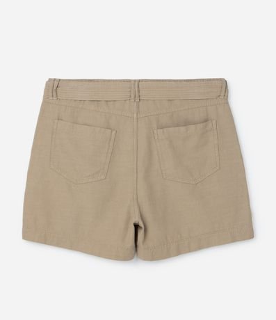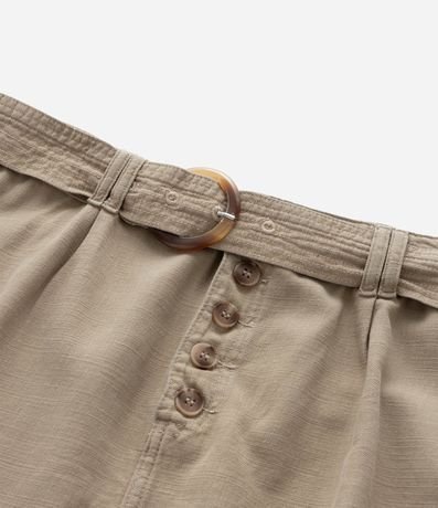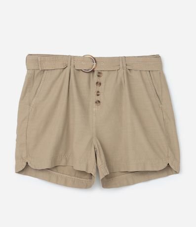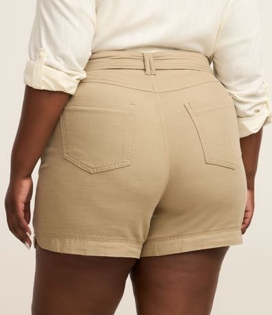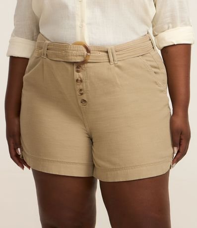 Short feminino Curve & Plus Size em sarja de algodão mais sustentável, cós com passante, cinto com fivela arredondada, bolsos e botões com textura tartaruga.