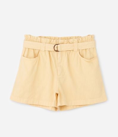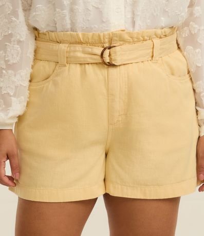 Short feminina Curve & Plus Size em sarja de algodão certificado bci com boas práticas ambientais, peça com cós fixo, pespontado, passantes, fechamento tradicional e cinto com fivela redonda tartaruga.