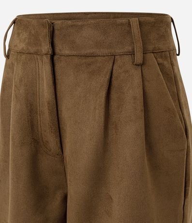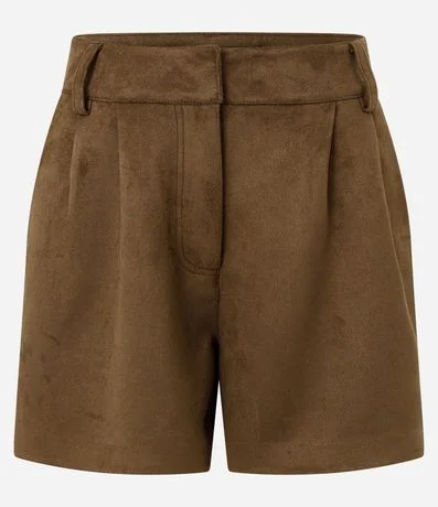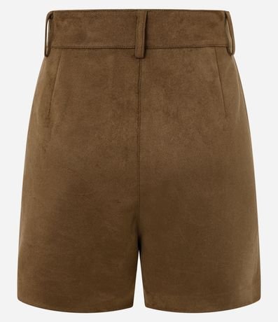 Short feminino confeccionado em suede de poliéster com toque macio e acabamento aveludado, apresentando modelagem em A que valoriza a silhueta com conforto. A peça possui cós estruturado com passantes, pregas frontais que adicionam sofisticação e fechamento funcional, tornando o design versátil para composições casuais ou mais alinhadas no dia a dia.