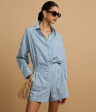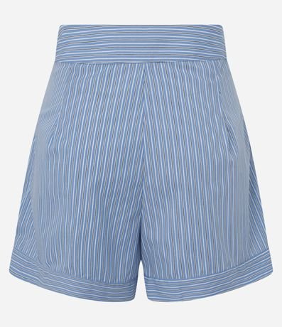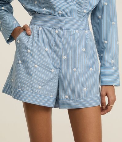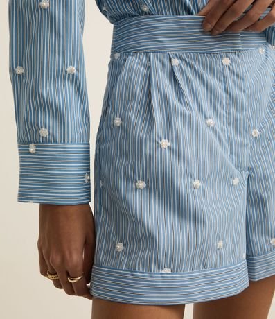 Ref: Short feminino confeccionado em tricoline, com cós largo, pérolas aplicadas e estampa de listras a fio tinto.