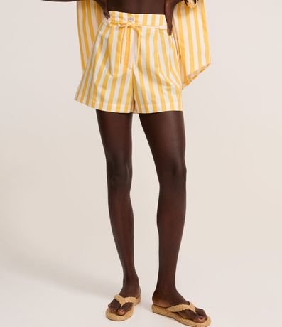 Ref: Short feminino confeccionado em tricoline de algodão certificado bci, modelo curto com cintura alta, elástico, fechamento tradicional, cinto fino de amarração e listras.