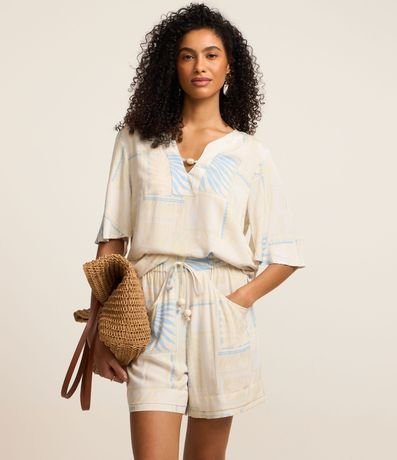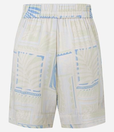 Short reto confeccionado em viscose com elástico e amarração na cintura além de miçangas na amarração e bolsos. Estampada com folhagens em tonalidades gradientes.