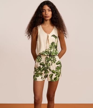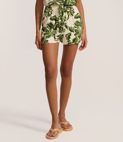 Short feminino confeccionado em viscose certificada com cós elástico, amarração e estampa de folhagem.