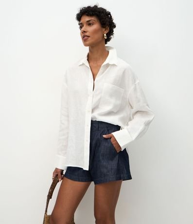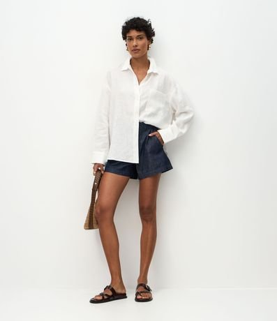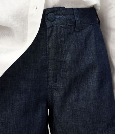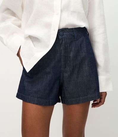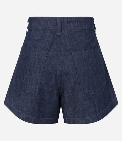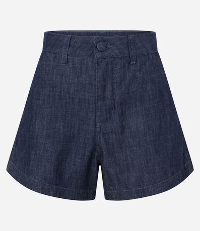 Ref: Short evasê, curto, confeccionado em jeans com algodão bci mais sustentável e botão forrado no cós.