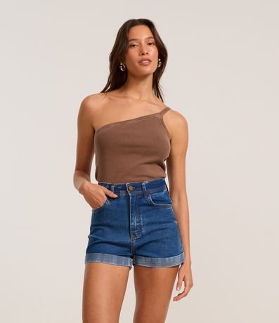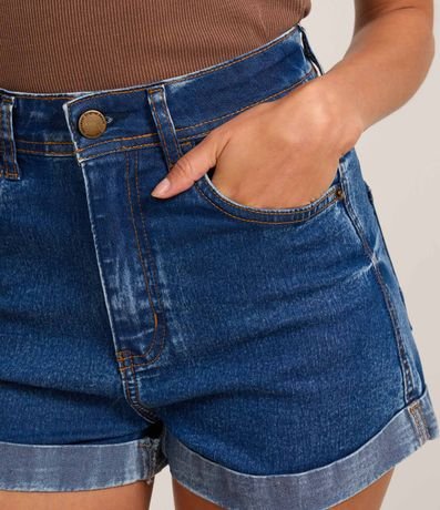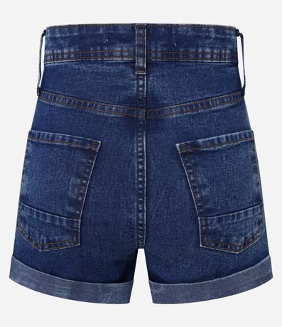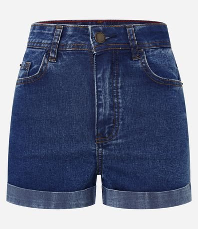 Ref: Short hotpants confeccionado em jeans com algodão bci mais sustentável, cintura alta, sem estampa e com barra dobradinha.