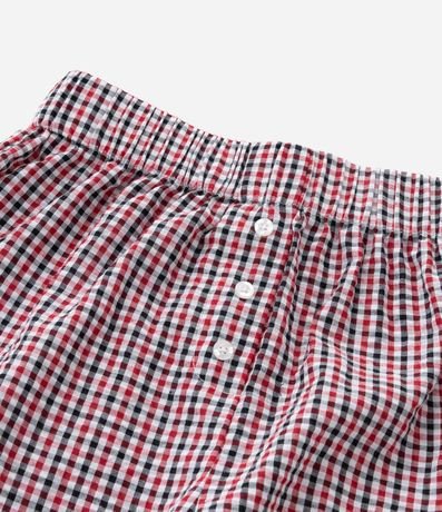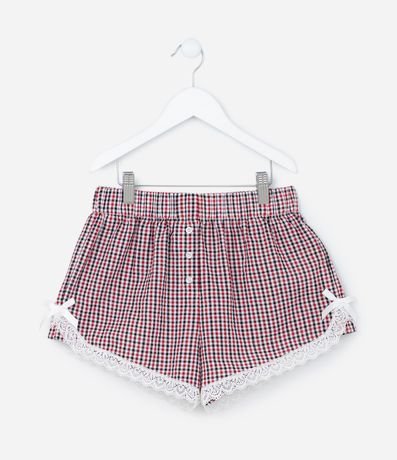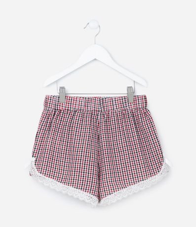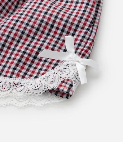 Ref: Short infantil confeccionado em tricoline de algodão mais sustentável, com elástico no cós, aplicações de botões, rendinha na barra e estampa xadrez.
