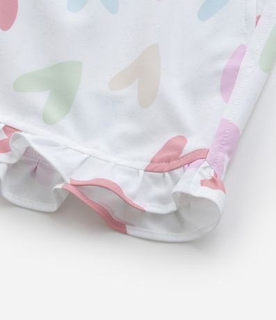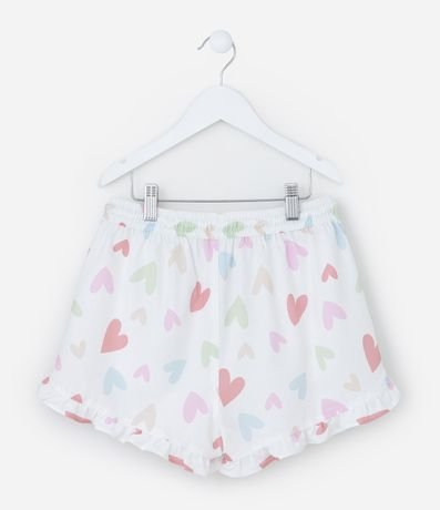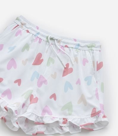 Ref: Short infantil confeccionado em microfibra leve, com amarração no cós, bolsos, estampa de corações e babadinho na barra.
