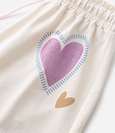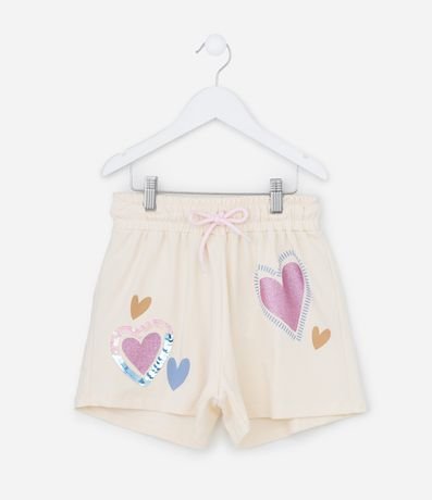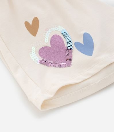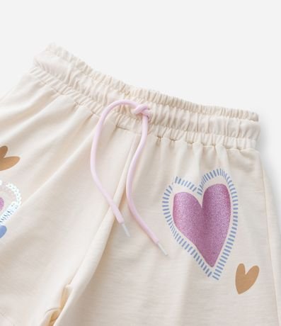 Ref: Short infantil confeccionado em moletom sem forro fleece, com cós elástico, amarração e bordado de corações em paetês que viram e com brilhos. Peça confeccionada com material e processo mais sustentável.