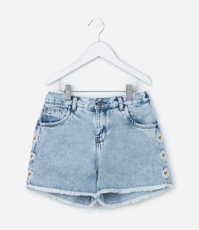 Ref: Short infantil confeccionado em jeans de material mais sustentável. Possui elástico ajustável no cós, bolsos, bordado de margaridas, barra desfiada.
