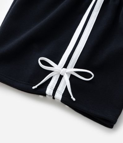 Short infantil confeccionado em moletom de superfície lisa e toque macio. Possui modelagem regular com cós elástico embutido e caimento solto. O detalhe de friso lateral em contraste percorre toda a lateral da peça, finalizando na barra com aplicação de laço decorativo que adiciona acabamento diferenciado e leitura esportiva ao visual.