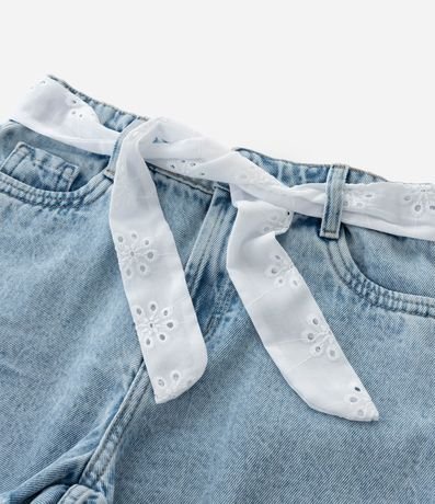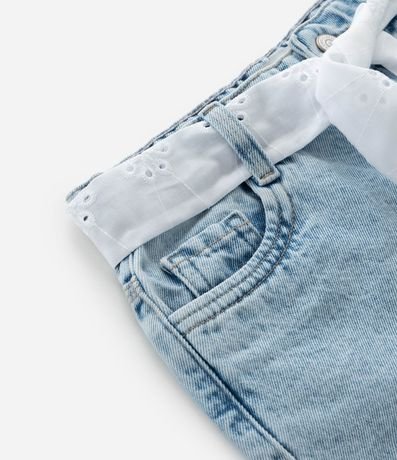 Ref: Short infantil confeccionado em jeans, de modelo regular, com bolsos e barra desfiada. A peça conta com fechamento frontal tradicional e vem acompanhado de um cinto faixa de broderie.