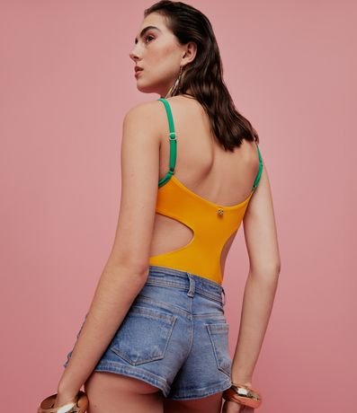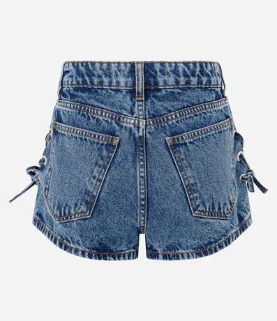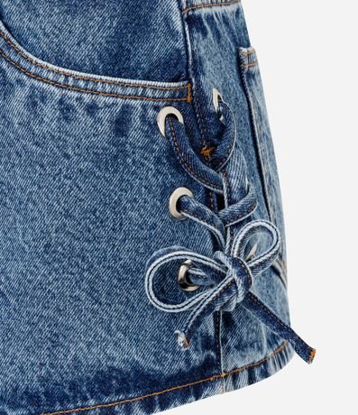 Ref: Short micro, confeccionado em jeans, de cintura baixa, com passantes no cós, fechamento tradicional e amarrações laterais. Este produto possui material mais sustentável em sua composição, sendo ambientalmente mais responsável.