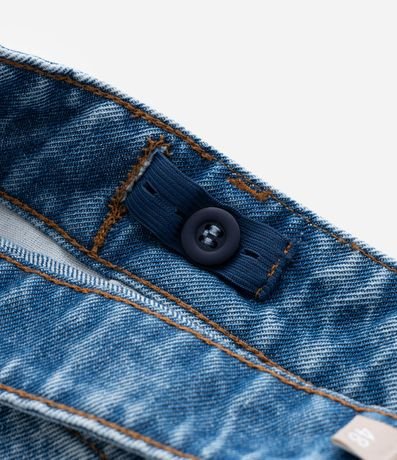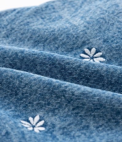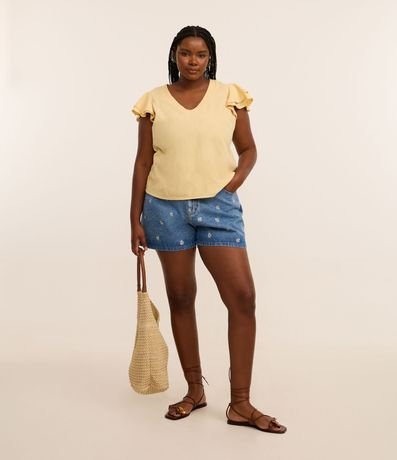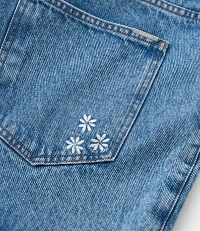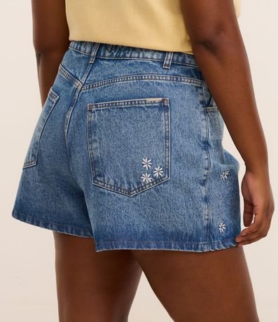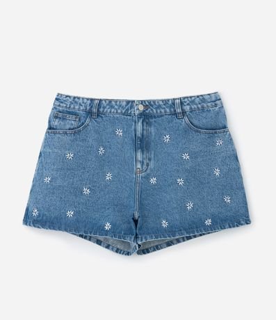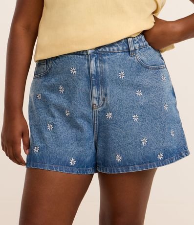 Ref: Short feminino Curve & Plus Size confeccionado em jeans de algodão certificado bci, peça no modelo mom com cós fixo, passantes, fechamento tradicional, botão interno para ajustes, bolsos e estampa bordada de margaridas.