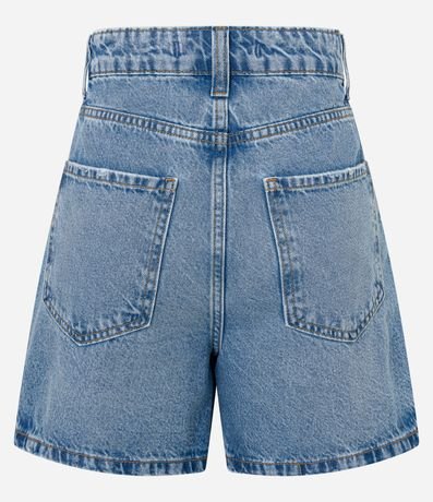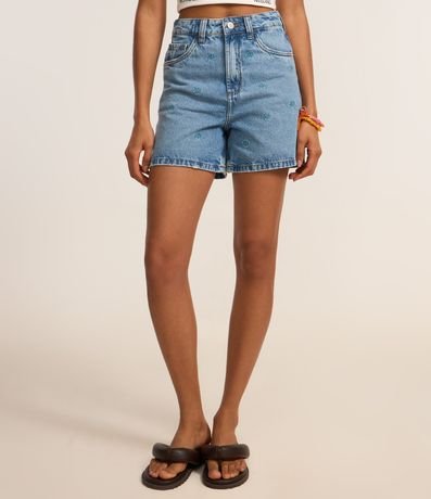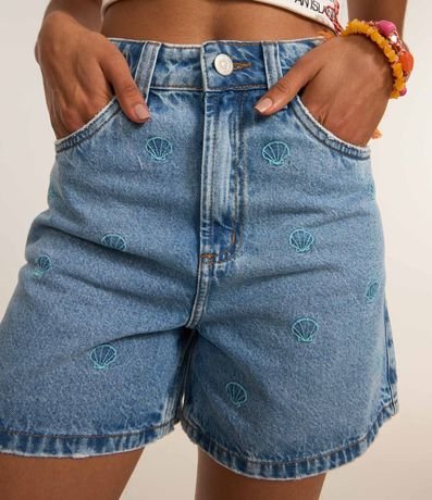 Short jeans modelo mom com cintura alta e bordado de conchas.