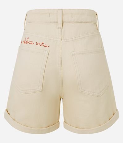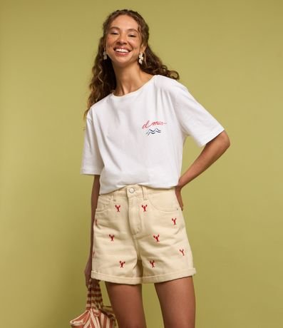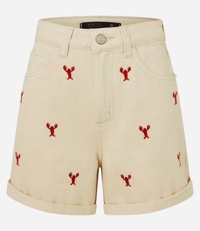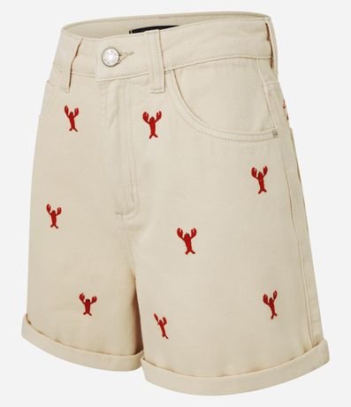 Ref: Short jeans modelo mom com bordado frontal de pequenas lagostas e lettering "la dolce vita" na parte traseira. A peça tem passantes na cintura, fechamento tradicional e bolsos.