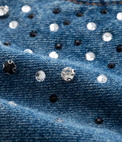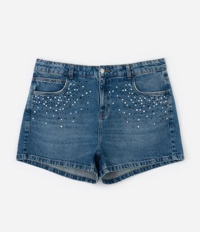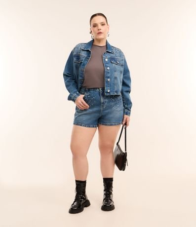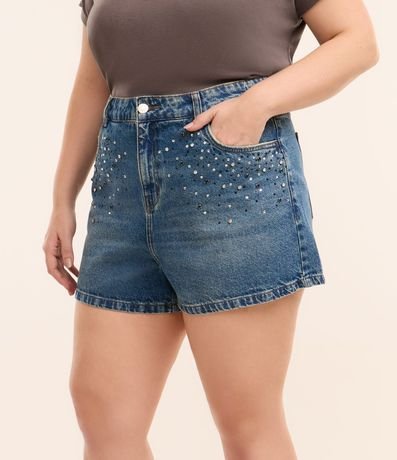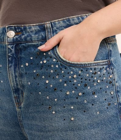 Ref: Short Feminino Curve & Plus Size, confeccionado em jeans de algodão mais sustentável com boas práticas ambientais, peça no modelo mom com cós passante, ajuste interno e aplicação de strass brilhosos garantindo um charme a mais para o look.