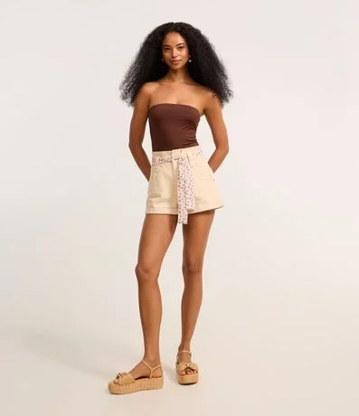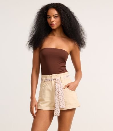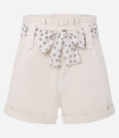 Ref: Short mom confeccionado em sarja com algodão bci e produzido em boas práticas ambientais. Cinto lenço com estampa de florzinhas e barra dobrada.