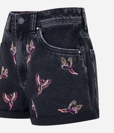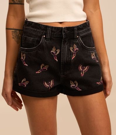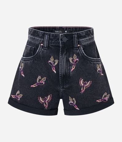 Ref: Short mom jeans com cintura alta, passantes no cós, bolsos frente e costas e bordadinhos de tucanos.
