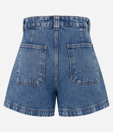 Ref: Short mom confeccionado em jeans, preguinhas frontais, bolsos frente e costas, passantes no cós e estampa no cós interno.