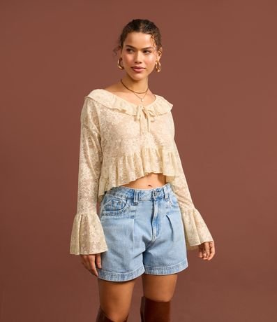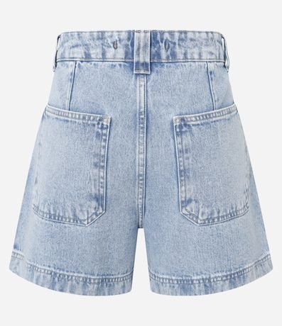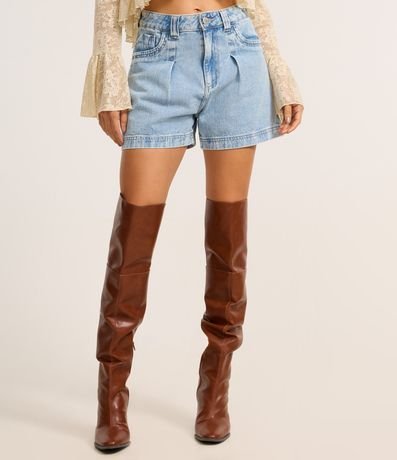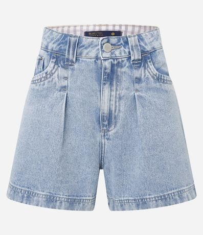 Ref: Short mom confeccionado em jeans, preguinhas frontais, bolsos frente e costas, passantes no cós e estampa no cós interno.