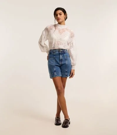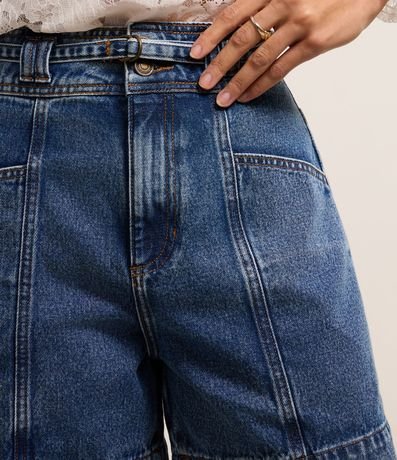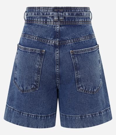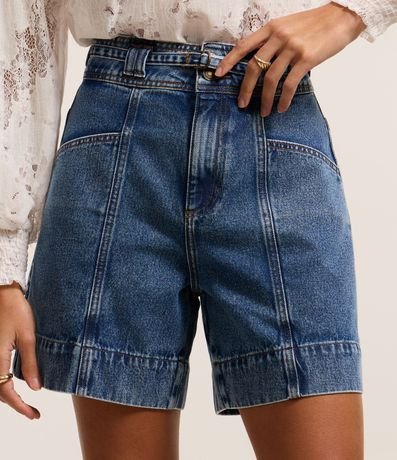 Ref: Short regular de cintura alta confeccionado em jeans com passantes duplos e cinto de tecido estreito na cintura, bolsos e recortes diferenciados.