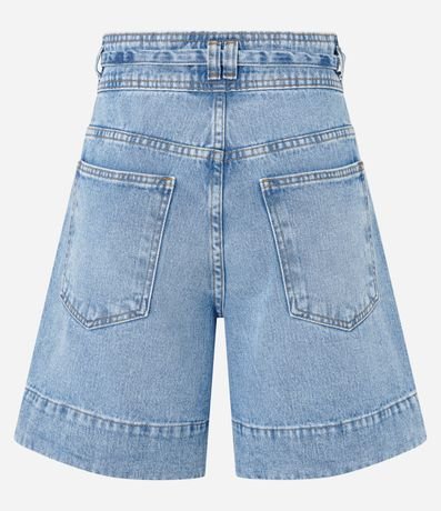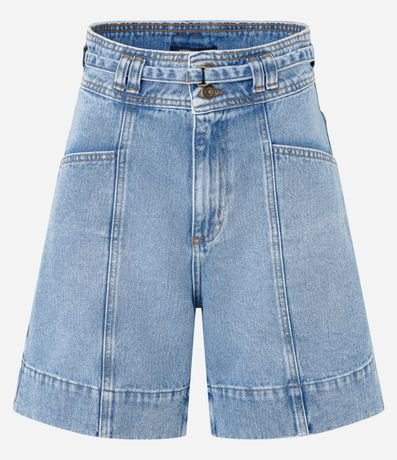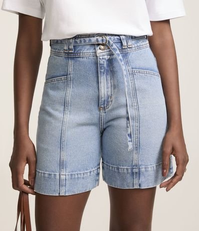 Ref: Short regular de cintura alta confeccionado em jeans com passantes duplos e cinto de tecido estreito na cintura, bolsos e recortes diferenciados.
