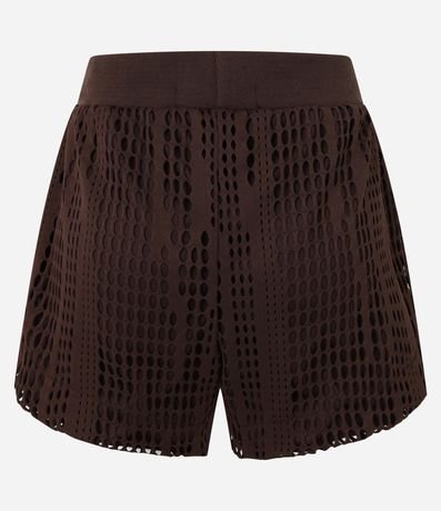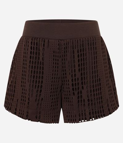Short curto feminino de modelo regular, confeccionado em poliéster com elastano, com textura furadinha e cós elástico em tricô. Possui forro.