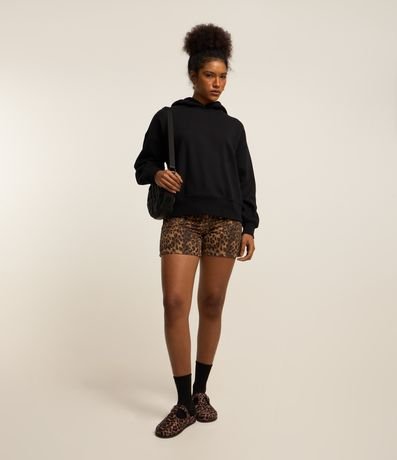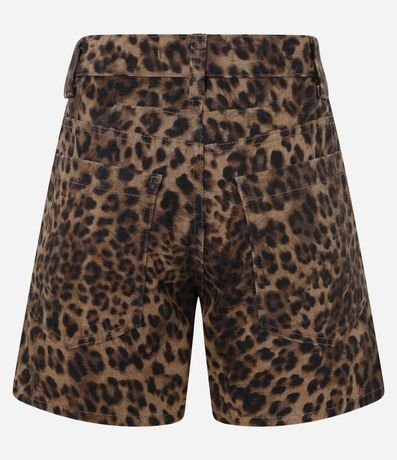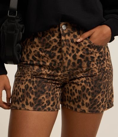 Ref: Short regular em jeans, cós com passantes, fechamento por botão e zíper, bolso e estampa animal print oncinha.