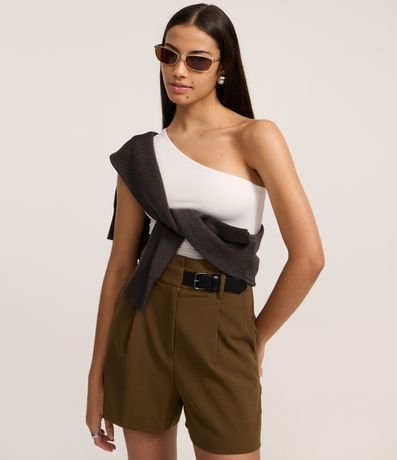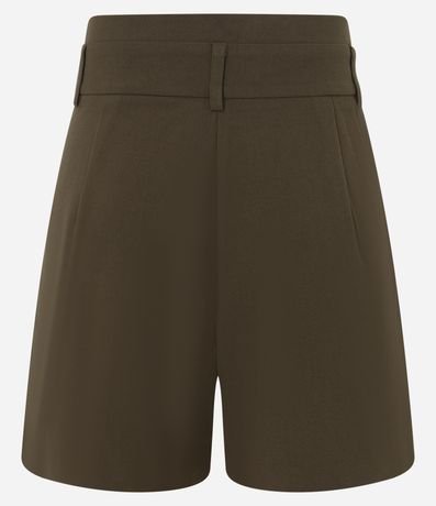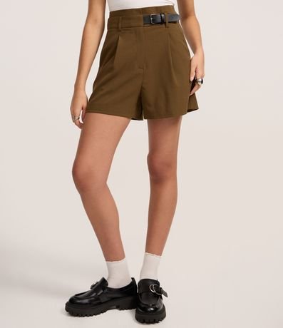 Ref: Short feminino em Alfaiataria confeccionado com viscose certificada, peça no modelo reta com cintura alta, cós passante, fechamento tradicional, pregas e detalhe de meio cinto com fivela lateral.