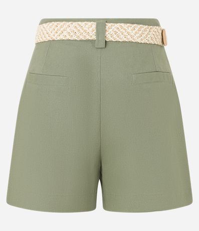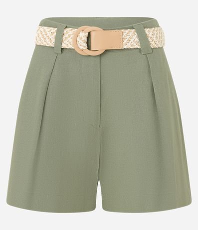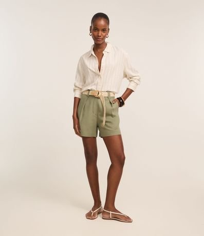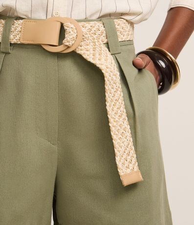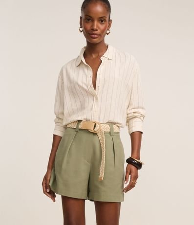 Short reto de cintura alta, confeccionado em viscolinho, com passantes na cintura, pregas e fechamento tradicional. Inclui cinto de ráfia artificial com fivelas de argolas. Este produto possui viscose certificada em sua composição, sendo ambientalmente mais responsável.