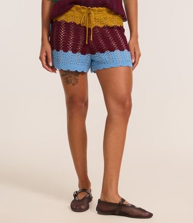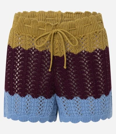 Ref: Short feminino confeccionado em tricô, peça reta curta com amarração no cós e bloco de cores.