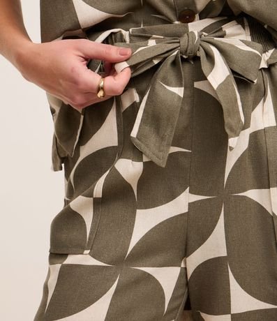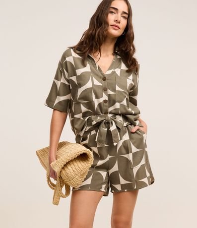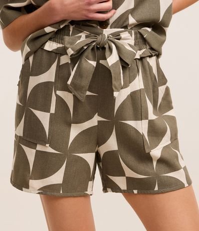 Ref: Short runner, confeccionado em viscolinho com viscose mais sustentável e 30% de linho, com elástico de cinto de tecido para amarração na cintura. A peça tem estamparia geométrica com traços rupestres em efeito aquarelado.