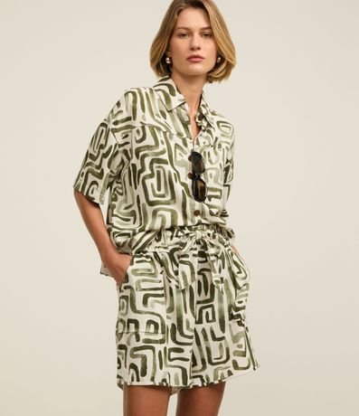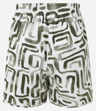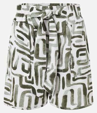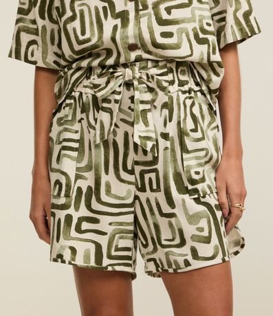 Short de modelo runner confeccionado em viscose e linho, com amarração na cintura e estampa geométrica.
