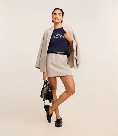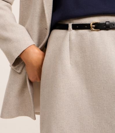 Short saia de estrutura alfaiatada, confeccionado em polivelour, com passantes na cintura e fechamento por zíper dianteiro. Roupa tem recorte V na parte traseira do cós, além de pregas frontais e pences dianteiros. Inclui cinto fino de material sintético com fivela.