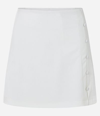 Short saia curto confeccionado em crepe com botões forrados na lateral e sem estampa.