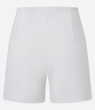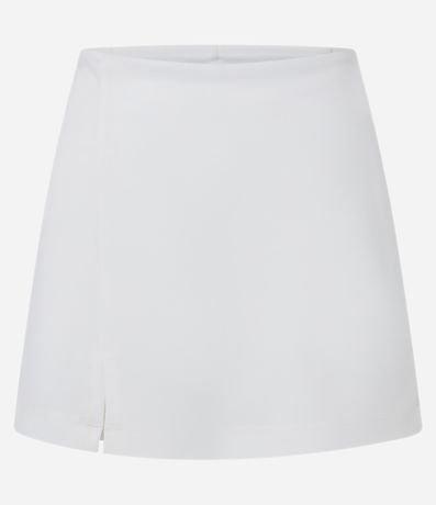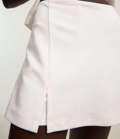 Short saia curto, confeccionado em crepe com recortes frontais e fendinha na barra.