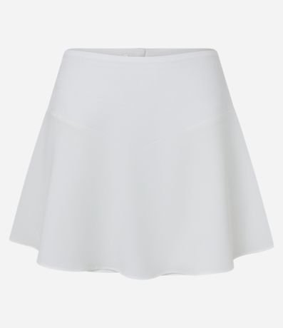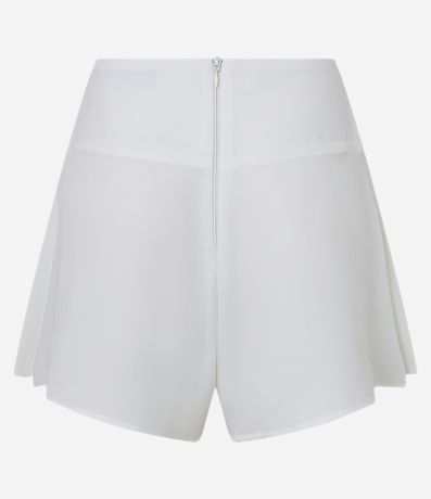Short saia curto, soltinho, confeccionado em crepe e com fechamento por zíper nas costas.