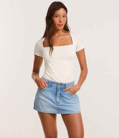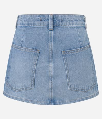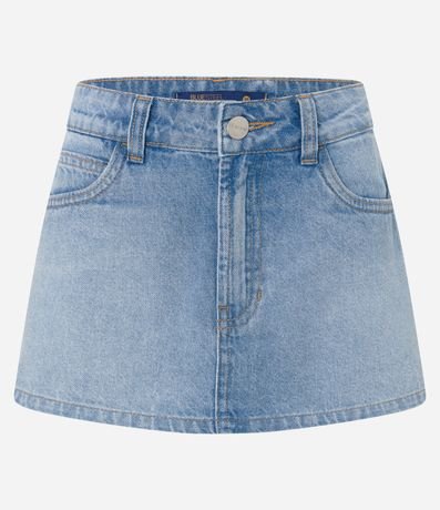 Ref: Short saia feminino confeccionado em jeans, de modelo curto e com cintura baixa. Possui bolsos tradicionais e fechamento frontal com botão e zíper.