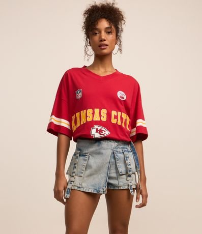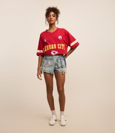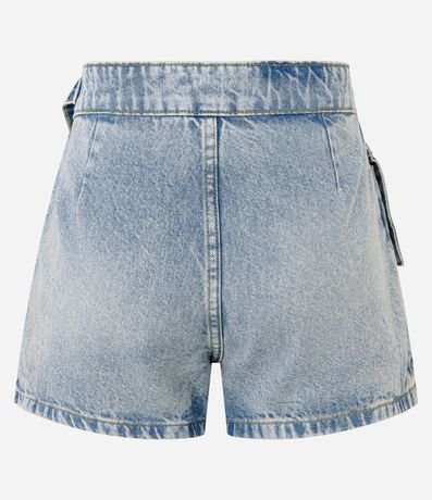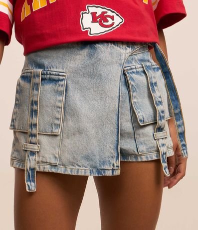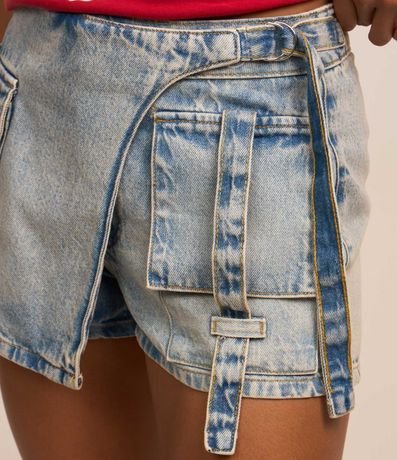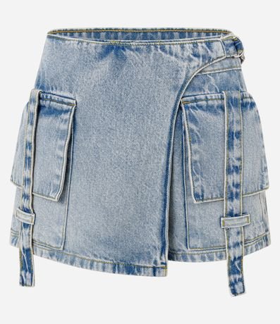 Ref: Short saia curto confeccionado em jeans, transpassado com fivela na lateral da cintura, bolso cargo e sem estampa.
