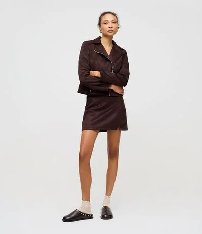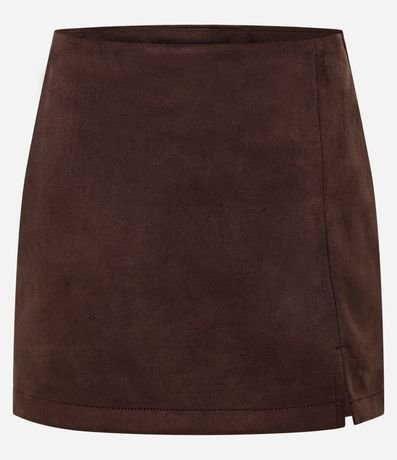 Short saia feminino de modelo curto, confeccionado em suede, com cós liso e fixo, sem estampa e com detalhe de mini fenda na barra. Possui fechamento com zíper na lateral.